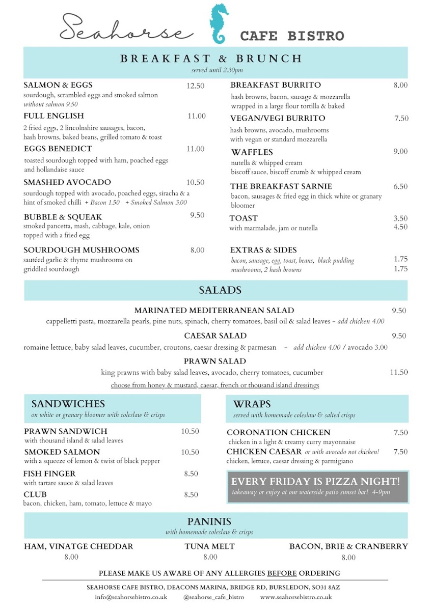 Welcome to Seahorse Bistro, a delightful café nestled within Deacons Boatyard in Bursledon. This charming spot offers a varied menu, ideal for brunch or lunch, and is sure to satisfy diverse palates.